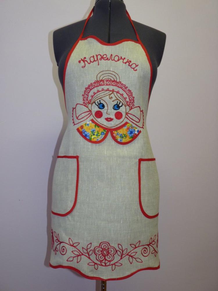 34/1-99 Фартук женский с надписью "Карелочка", "Хозяюшка" и вышивка "Матрешка" по груди, 1200 руб.